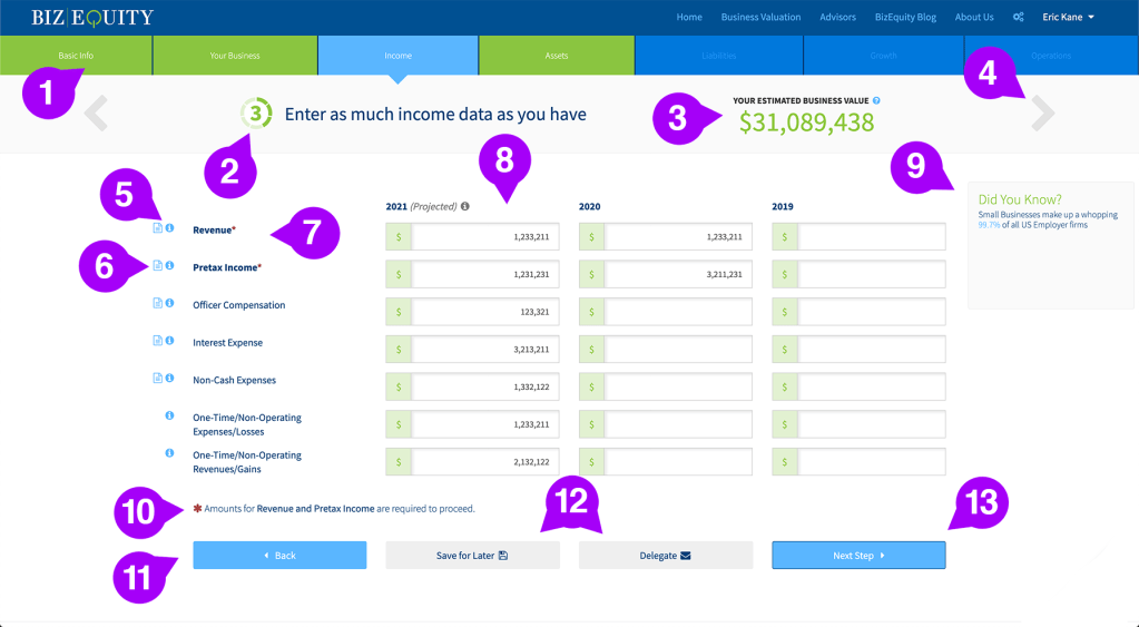 We found in our iterations of the steps within the valuation that users completed the form fields that are needed at baseline for a valuation when we separated them out and gathered them up front. If we were able to gather: industry, location, revenue, and income we could give a valuation estimate range immediately. The remaining process would then clearly refine and provide a more accurate valuation. Using a prototype I was able to present the different options to the stakeholders and development team and get feedback to decide which versions to A/B test.
