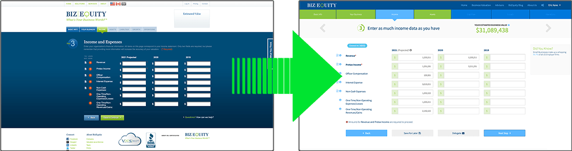 The previous version of BizEquity’s online valuation platform was built primarily as a proof of concept and a way to simply visualize the algorithm. Users were a secondary concern in the creation of the original tool.